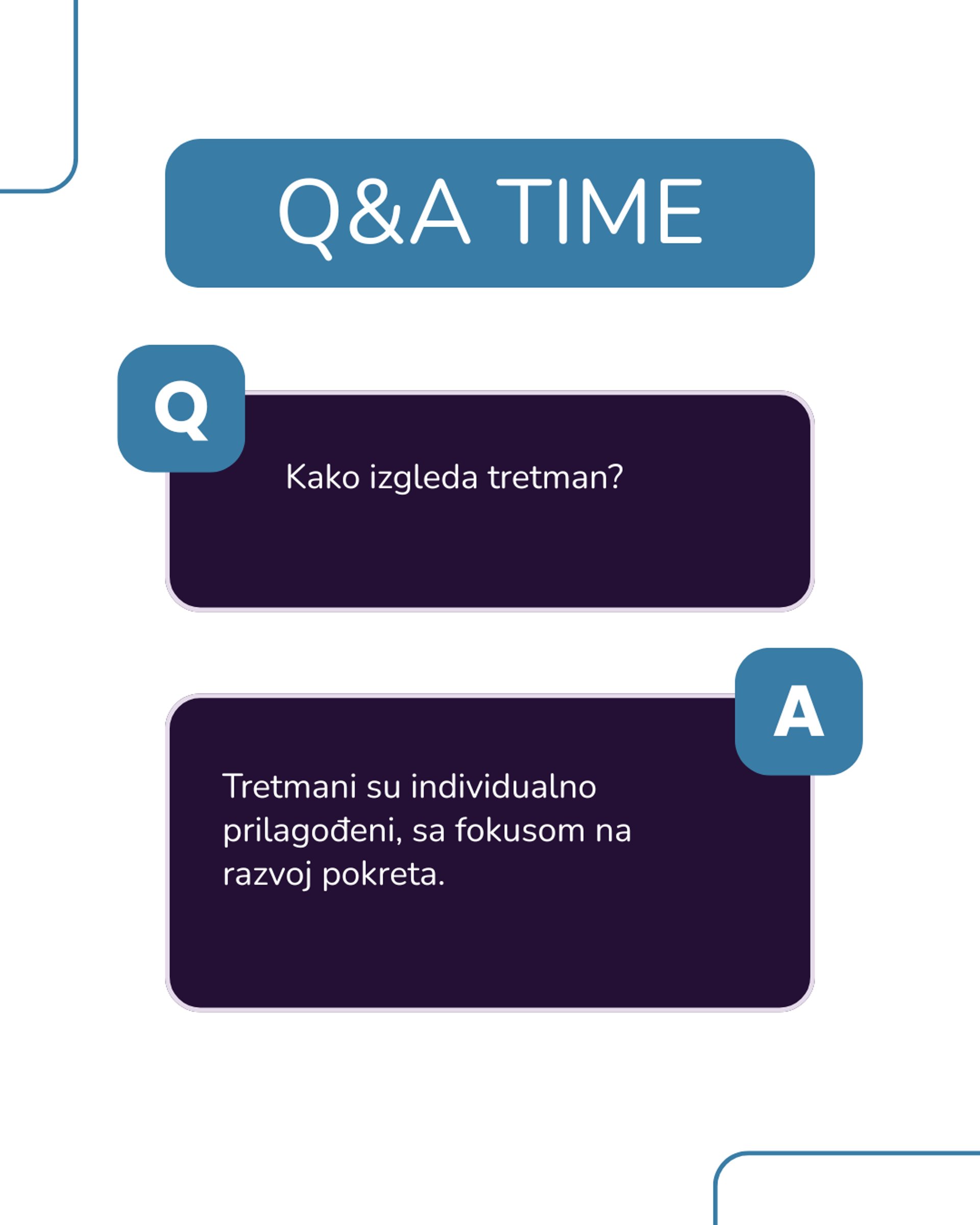 Tretmani su individualno prilagođeni, sa fokusom na razvoj pokreta.