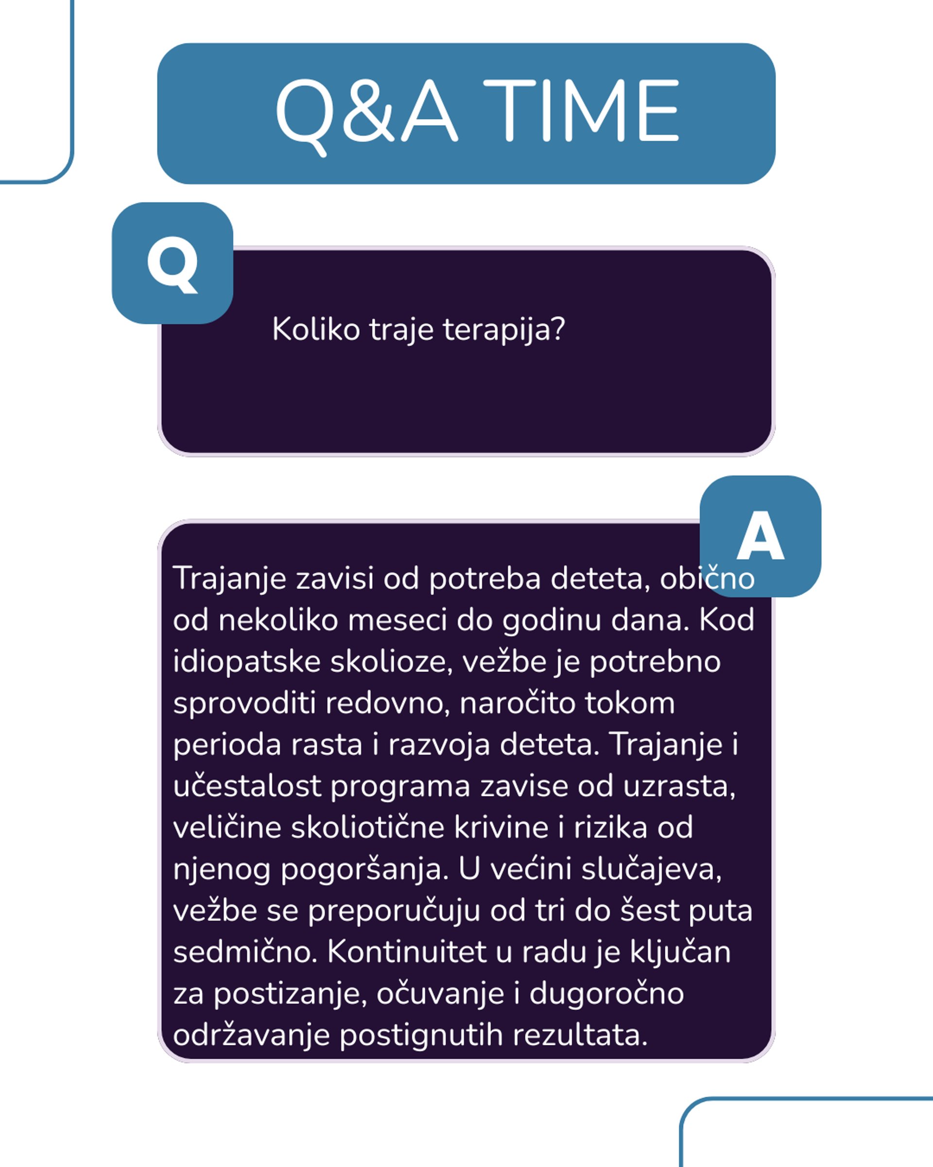 Trajanje zavisi od potreba deteta, obično od nekoliko meseci do godinu dana. Kod idiopatske skolioze, vežbe je potrebno sprovoditi redovno, naročito tokom perioda rasta i razvoja deteta. Trajanje i učestalost programa zavise od uzrasta, veličine skoliotične krivine i rizika od njenog pogoršanja. U većini slučajeva, vežbe se preporučuju od tri do šest puta sedmično. Kontinuitet u radu je ključan za postizanje, očuvanje i dugoročno održavanje postignutih rezultata.